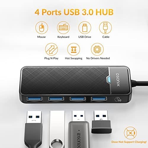 【4-Port USB 3.0 Hub】iDsonix USB 3.0 hub can easily expand one USB C port of a computer to 4 USB A ports and is allowed 4 ports simultaneously use. Compatible with USB Flash Drive, Mouse, Keyboard or any other USB devices. (Note: This USB hub dose not support for charging !)