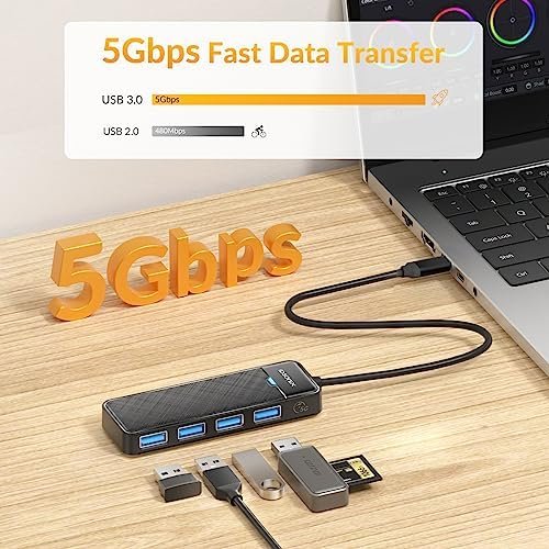 【Ultra Speed 5Gbps Data Transfer】This 4-Port USB C Hub 3.0 hub can reach up to 5Gbps data transmission, which is more than 10 times faster than USB 2.0. It’s also backward compatible with USB 2.0 or 1.1 devices. 1G files can transfer in seconds.