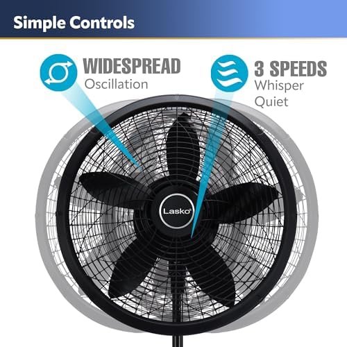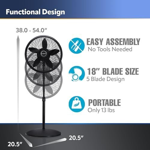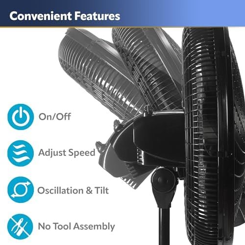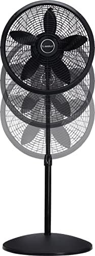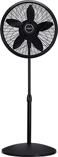 This sleekly designed pedestal fan has an 18-inch blade and features 3 speeds, widespread oscillation, adjustable height, and tilt fan head for customized airflow. It offers a quiet operation with energy-efficient, superior performance. It is easy to assemble and requires no tools. To ensure utmost safety, this adjustable fan is E.T.L-listed and includes a fused safety plug.