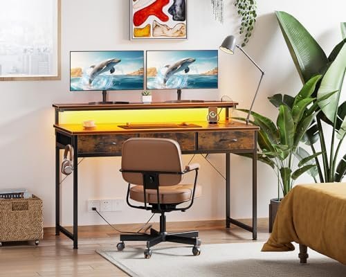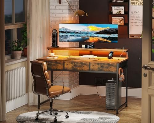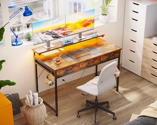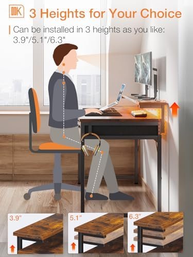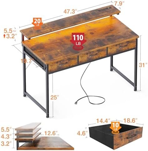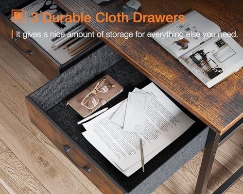 【Desk with Drawers & Monitor Stand】The home office desk has 3 large capacity fabric drawers, keeping your office or study supplies in order and dust-free. The 3-gear monitor stand (3.2″、4.3″、5.5″) provides an ergonomic view angle for people of different heights in different use environments. The monitor stand is also removable without screw holes left on the desktop.