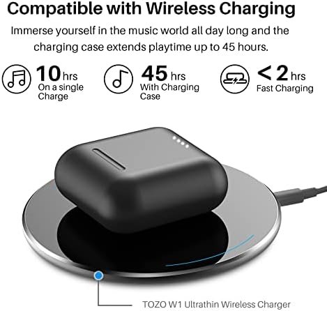 [45Hrs Playtime Endurance] Playtime lasts for over 10 hours from single charge and total 45 hours with charging case. Enjoy fast charging, to fully charge the rechargerable case only 55 minutes via cable or less than 2 hours via wireless charger. Providing convenient charging way with no strings attached.